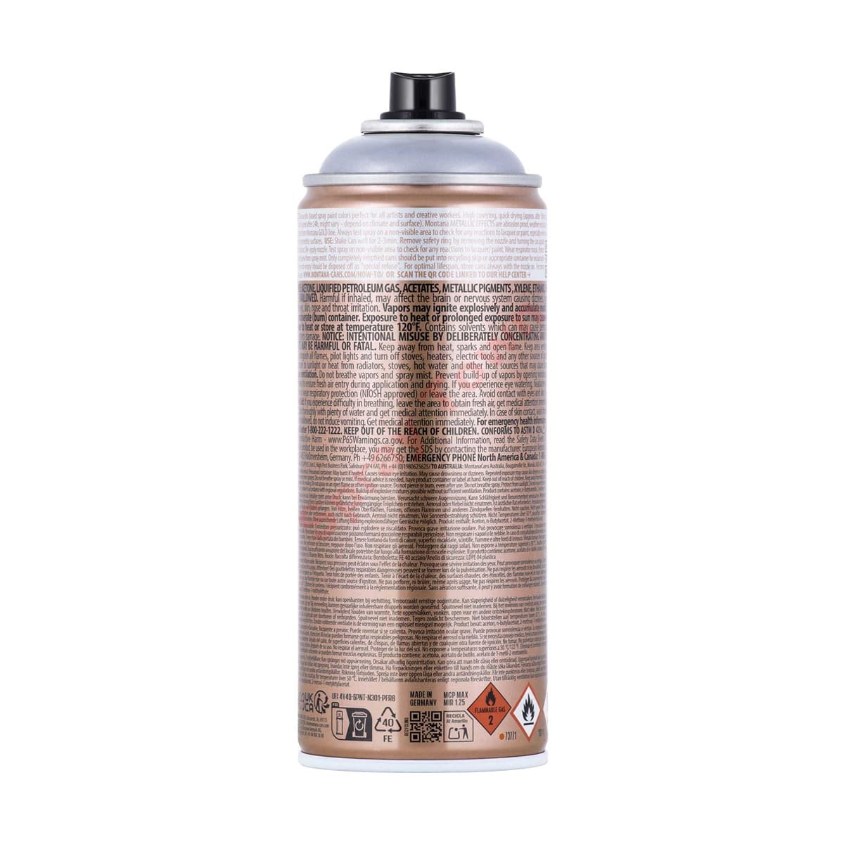 Montana Metallic 400ml — это краска с металлическим эффектом объёмом 400 мл. Данный баллон оснащён кэпом Montana Standard, что обеспечивает отличный выход краски при среднем нажатии. Цвета Montana Metallic Effect идеально подходят для нанесения на функциональные объекты, такие как велосипеды, автомобили и мебель. Так же они могут добавить металлический блик в любой творческий или художественный проект на бумаге, картоне, грунтованном холсте, дереве, стекле, металле, керамике, фарфоре, камне, акриле и другие лакокрасочные материалы.